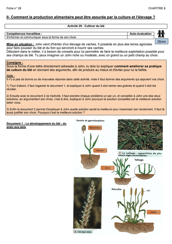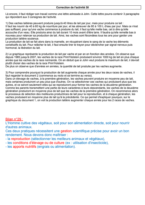 - Semaine n°12 (du 15/06 au 20/06) : Dans la continuité de l'activité 29, où on a vu un moyen de production alimentaire par l'agriculture, on va cette fois-ci, dans l'activité 30, se concentrer sur un élevage. Le travail est la suite de l'activité 29, pensez à aller consulter la correction et à noter le bilan après avoir réalisé l'activité.