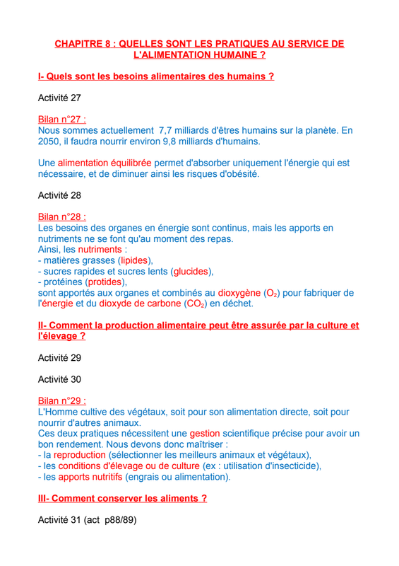 - Semaine n°9 (du 25/05 au 29/05) : Cette semaine on commence le chapitre 8 (qui sera aussi le dernier chapitre de l'année !), on va se pencher sur l'alimentation humaine, aussi bien nos besoins que nos façons de produire et de conserver nos aliments. Il faut donc réaliser cette semaine la fiche n°27, en faisant l'activité, puis en remplissant le bilan.