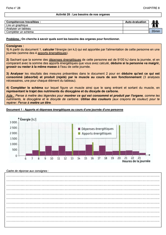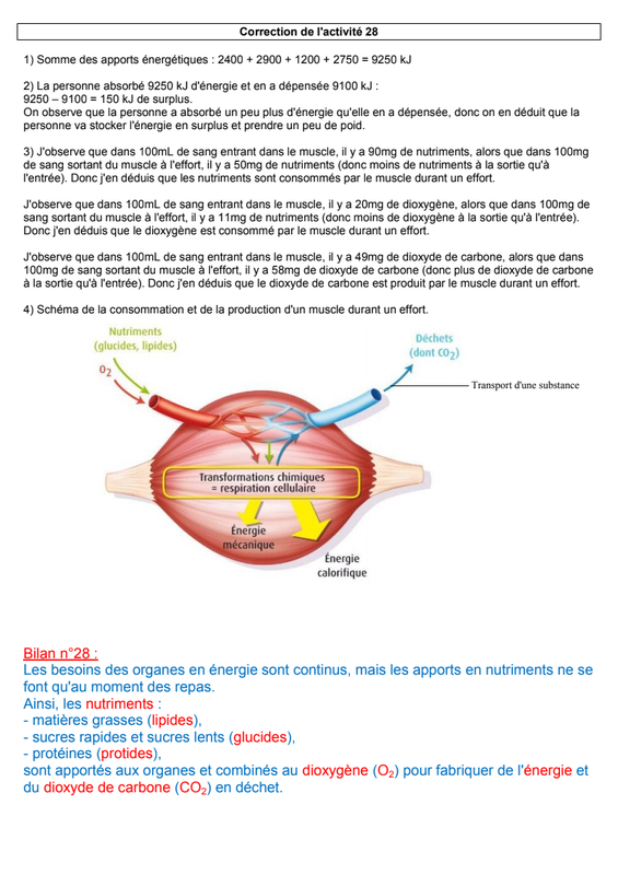 - Semaine n°10 (du 01/06 au 05/06) : Après avoir vu quels étaient nos besoins alimentaires, on va maintenant se concentrer sur les besoins de nos organes. Vous pouvez donc réaliser l'activité 28, vous corriger et noter et apprendre le bilan n°28.