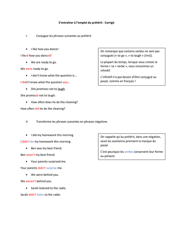 S'Entraîner À L'Emploi Du Prétérit Corrigé 19